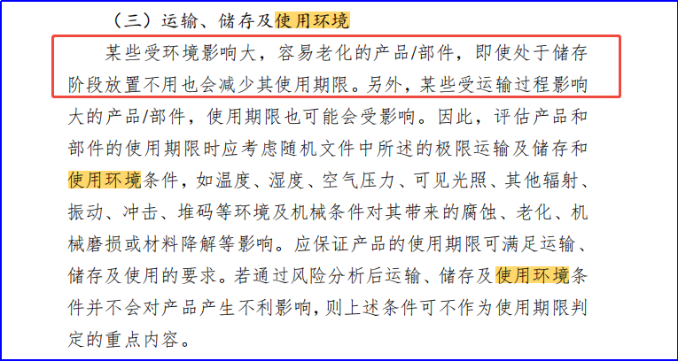 圖2 指導(dǎo)原則中關(guān)于醫(yī)療器械使用期限評(píng)價(jià)應(yīng)考慮使用環(huán)境影響的說明