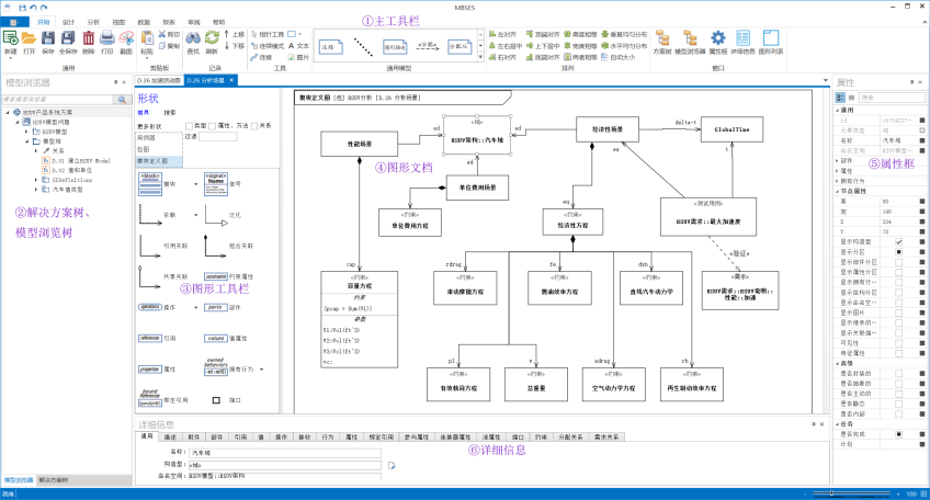 MBSES主界面功能區(qū)域如圖1:主工具欄、解決方案樹、模型瀏覽器、圖形工具欄、圖形文檔、屬性框和詳細信息。