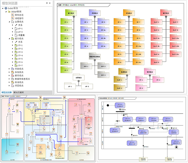 - 可建立體系的全景、能力、操作(作戰(zhàn))、服務、系統(tǒng)、數(shù)據(jù)和信息、項目、標準、安全等視點(視角)的各種視圖。能夠基于作戰(zhàn)活動視圖或系統(tǒng)活動視圖等進行仿真,完成體系需求論證、體系架構設計、作戰(zhàn)過程推演等工作。